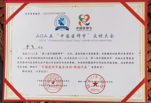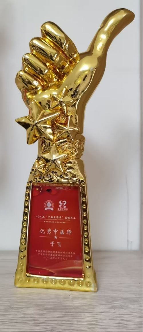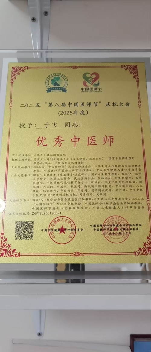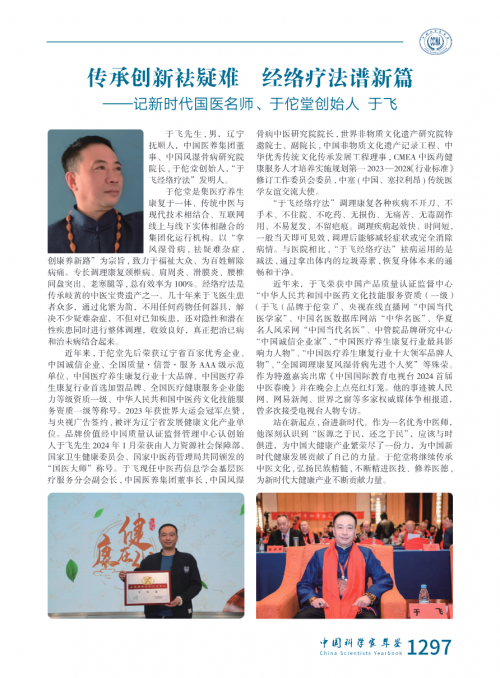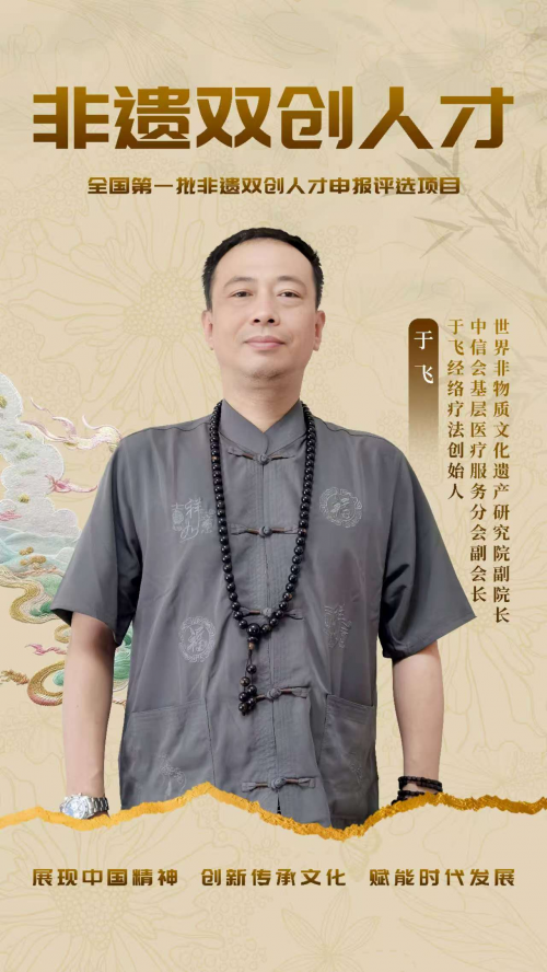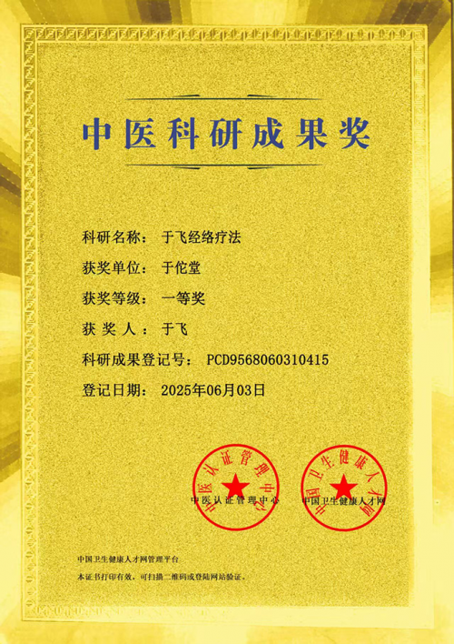 “于飞经络疗法”:2023年,被列为中国非物质文化遗产。2024年,荣获第27届俄罗斯“阿基米德”国际创新发明奖金奖。