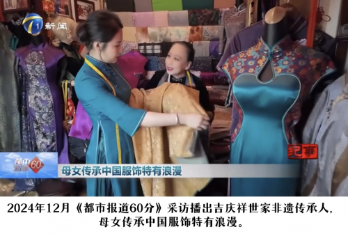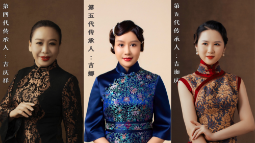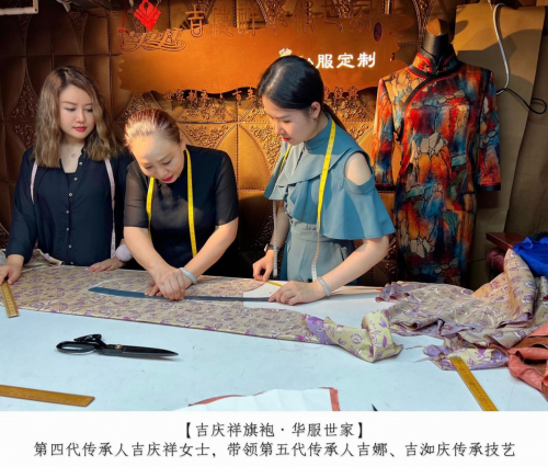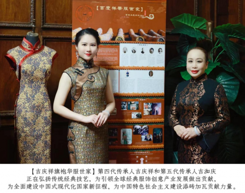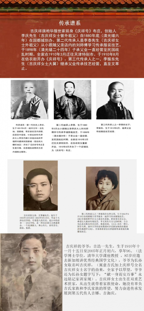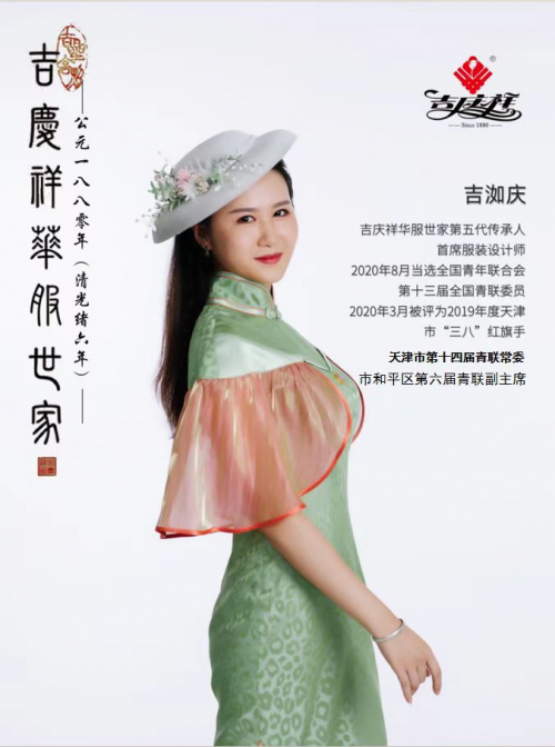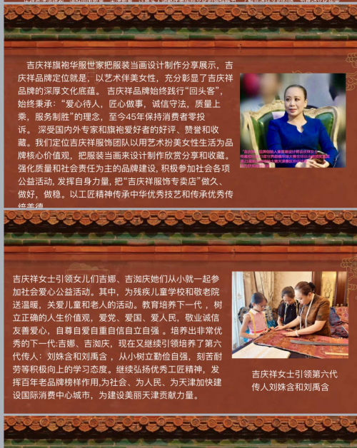140多年历史延续至今已经传承发展到第五代传人;吉娜、吉洳庆。她们从小就跟随母亲吉庆祥女士参加爱心公益活动。在母亲吉庆祥女士的言传身教和耳濡目染下,吉洳庆和姐姐吉娜,自幼与旗袍结缘,如今已成为第五代传人。她们都非常优秀进取,其中姐姐吉娜荣获由市妇联联合颁发的天津市“最美女性称号”等证书。在吉庆祥华服世家的华服体验馆里,展示着上万款不同时期的旗袍,每一件旗袍都如同老电影中的长镜头,讲述着过去与未来之间的故事。吉洳庆自幼便在这片艺术的殿堂里穿梭,看着母亲一针一线地倾注着对旗袍文化的理解与热爱。在母亲的熏陶下,她渐渐地爱上了这象征着东方女性独特意象和风韵的旗袍,并开始跟随母亲学习独门剪裁技艺。
