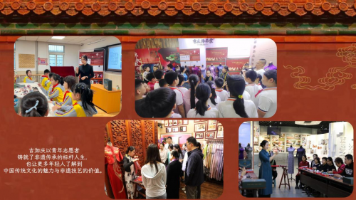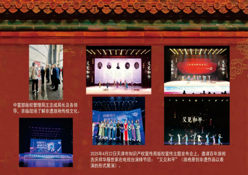 2025年第五代传承人吉洳庆女士走进朝阳里社区,带领社区老人与孩子们动手制作盘扣与刺绣,让大家体验手工制作乐趣。还经常走进敬老院,残疾人学校等,为老人和残疾儿童们提供爱心服务。她积极参与各种公益活动,通过走进大学校园、社区、开设青年公益课堂,展示活动等方式,向更多人介绍引领发挥优秀青年作用,非遗技艺工匠精神及中国优秀传统文化元素应用到华服当中和各个领域当中,涌入了新时代青年的新需求,设计出了许多新中式时尚华服吉氏·庆祥号旗袍以其深厚的历史底蕴、精湛的手工技艺和不断创新的设计理念,不仅承载了东方女性的柔美与温婉,更展现了中国传统文化的魅力与韵味,以传统美德为根基,鼓励每一位穿着它的女性,树立正确的人生观,传播正能量! 2025年天津市知识产权宣传周版权在电视台主题发布会”上《又见和平》主题节目,模特穿【吉庆祥百年旗袍】和【老美华鞋】表演舞蹈节目,赢得了专家与观众们的喜爱和好评,这标志着她的非遗事业迈向新的征程。