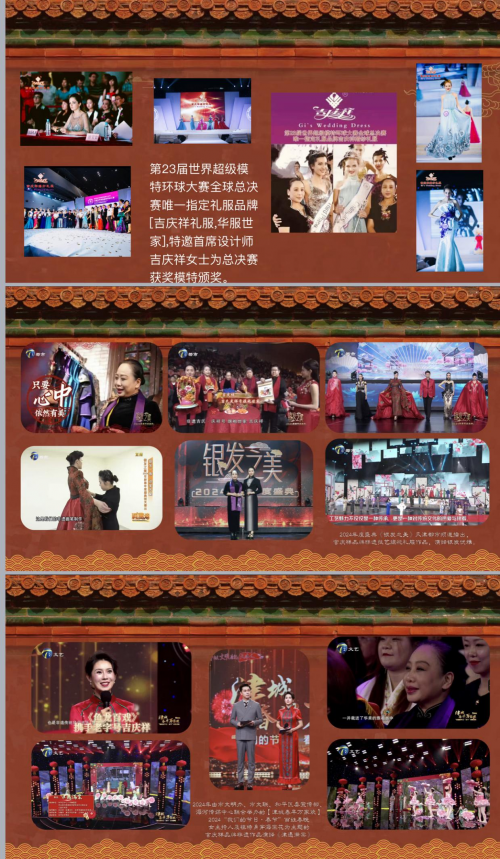 立志于发挥百年老品牌榜样作用,继续坚守消费者零投诉,以工匠精神传承优秀技艺,把服装当成画设计制作欣赏收藏展示,用艺术伴美女性,传播正能量带动更多女性温婉优雅知性,自信自律自强自立自尊自爱优雅高贵大方,弘扬中华优秀传统美德,感恩,传承,创新,家国,奉献,匠心文化。在一针一线一盘一扣中领略中国优秀传统手工艺文化。弘扬工匠精神和经典传统服饰文化技艺发展做贡献。吉洳庆是一位年仅27岁的“95后”女孩,家族也给她取名吉洳庆(更寄托了家族厚望),她正以青春与热情,续写着家族的辉煌篇章,不仅承载着五代人的匠心与梦想,在服装设计色彩方面非常有天赋,利用课余时间悉心学习,跟随母亲从小就参加各项大赛活动,弘扬工匠精神,多年来,她始终坚守初心,一直热心公益活动。其中,2013年第23届世界超级模特环球大赛全球总决赛,第21届新丝路模特大赛天津赛区,大赛组委会都是唯一指定吉庆祥品牌作品展演。吉洳庆女士担任首席设计师,设计作品得到世界超模赞誉,让中国旗袍在国际时尚界绽放光芒,轰动全球。在 2024-2025年天津电视台春晚跨年鼓楼春晚、都市频道春晚,文艺频道春晚,天津市侨界新春晚会,等9个频道春晚节目相继播放吉庆祥旗袍华服世家非遗技艺原创作品表演节目。还有由天津市文明办、市文联、和平区委宣传部、海河传媒中心联合举办的百姓春晚节目;(津遇满棠)、(时间都去哪儿了)、(又见和平)等节目演员穿的服装也是吉庆祥华服世家品牌作品表演节目。2025年春晚节目还荣获了百姓十大最喜爱的春晚节目奖杯。仅2024年她的作品在香港青年发展高峰论坛、夏季达沃斯论坛等国际场合展示,向世界传递东方美学的魅力。仅2024年至今就有60多次爱心展示活动。2024年至今,她在吉庆祥旗袍华服世家馆多次开设免费课程;赢得年轻学子们欢迎,吉庆祥旗袍华服世家开设旗袍体验馆,接待上万人参观学习。比如;教师团队和大学学生、各行各业、海内外人士等在此感受“敬业乐业、精益求精、善作善成”的工匠精神,成为文化传播的驿站。其中,2024年3月“相约和平·青春遇见海棠”举办和平青年夜校,为切合海棠主题,她专注设计海棠花纹样,面向青年公益开展传统手工技艺吉氏·庆祥号手工刺绣制作学习课程,深受广大青年的喜爱和赞扬。2024年南开大学国际中文日特邀吉洳庆为留学生主题讲座【中国优秀传统服饰文化鉴赏与吉氏·庆祥号非遗技艺百年传承文化】将传统文化进校园,受到中外学生们的欢迎和赞誉,2025年8月,荣膺客座教授称号。