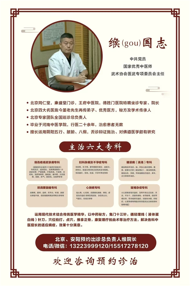 缑国志院长 缑国志,出生于安阳市滑县,自幼热爱中医。扎根基层实践学习,也为众多患者解除过无数痛苦。在诊疗体系上,缑国志院长有着独到的辨证思维与治疗体系。他擅长运用阴阳五行、脏腑、八纲及舌诊进行辨证施治,将佛道医学进行了深入研究与融合,将武术,气功与医术完美结合,形成了“整体观念、辨证精准、身心统治、施治灵活”的诊断治疗风格。二十多年无数临床经验总结,做了详细的案例记载,以文字、图片和视频进行详细记录,待进一步完善整理后出版,以便于更好的流传于后世。