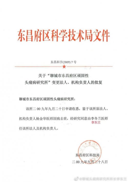 2009年,婆母杨金华所长逝世,东昌府区科技局和卫生局,批准李东兰为聊城市顽固性头痛病研究所现任所长,兼德医堂头痛病研究所,杨金华中医诊所,愈首堂崔金金诊所医学顾问。