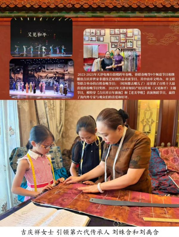 2023年至2025年,家族作品连续亮相天津电视台9个不同频道的春晚节目播放。其中,由天津市文明办主办、市文联等联合举办的2025春晚节目;《时间都去哪儿了》还荣获百姓最喜爱的春晚节目奖杯。这些展演不仅提升了品牌的知名度,更让传统技艺走进了千家万户。通过电视媒体,我们让更多普通人了解和喜爱旗袍文化,这是对我们传承工作的最大肯定吉庆祥说。