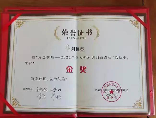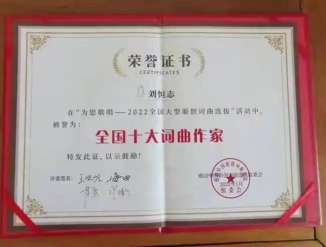 因创作海军新时代军歌《走向深蓝》而成为“走向深蓝”一词发明人,在《感动中国》人民喜爱的艺术家全国听(观)众群众性评选中,凭借《走向深蓝》(霍勇演唱)、《海军蓝》《大海誓言》(吕继宏演唱)、《领航新时代》(刘丹丽演唱)、《撸起袖子加油干》(何沐阳曲、周深等演唱)、《农民父兄》(春雷演唱)、《我们是英雄护航兵》《奔向海洋-海军士官学校校歌》《我们一同走过从前》(康澎曲 董文华演唱)、《战士·界碑·祖国》(于乃久演唱)、《伴你人间天地情》(杜克曲 白雪演唱)、《军旗情》(朱虹演唱)、《更多的时候》《足迹》(楚兴元曲、杨洪基演唱)、《光照四季》(莎光曲 谭晶演唱)、《丽江酒歌》(许镜清曲、阎维文演唱)、粤韵歌曲《领航新时代》(刘恒志作词,陈仲琰、卢华作曲,叶幼琪演唱)、《启航》(万山红演唱)、《永远青春的中华魂》(戴玉强、黄华丽演唱)等,荣获“中国十大词曲作家”称号。