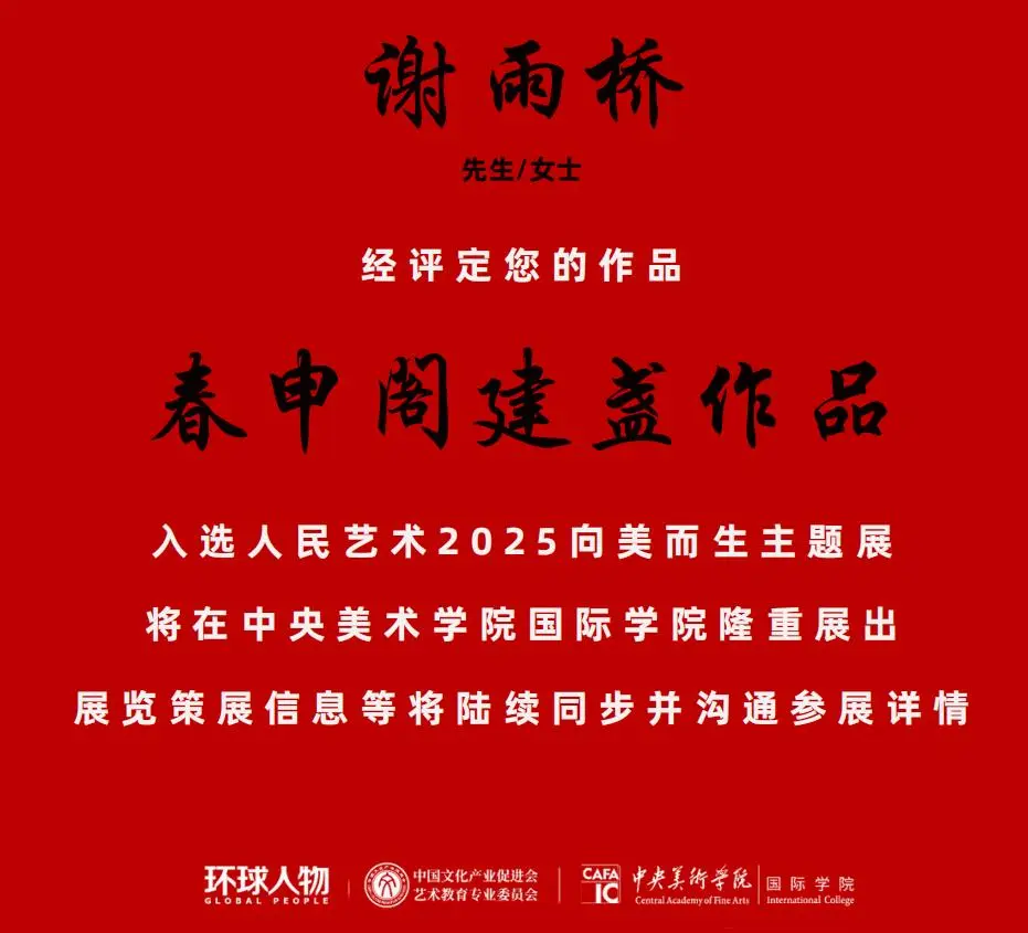 “2025人民艺术-向美而生”主题展由人民日报《环球人物》杂志社、中央美术学院国际学院、中国文化产业促进会联合主办,以“弘扬中华优秀传统文化,推进文化自信自强”为核心宗旨,艺术创作与传统文化创新表达。展览通过绘画、书法、工艺美术等多元形式,展现新时代艺术工作者对“一带一路”“乡村振兴”“科技人文融合”等国家战略的思考,构建“人民艺术”的审美共同体。